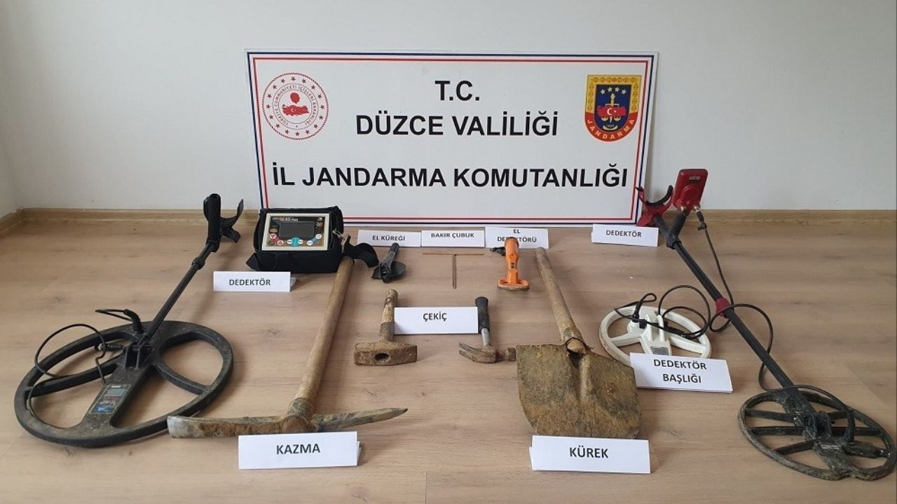 Cumayeri ilçesinde gerçekleştirilen çalışmada 3 dedektör, 2 kürek, 1 kazma, 2 bakır çubuk, 2 çekiç ve 3 şarj aleti bulundu. Şüpheliler hakkında adli işlem başlatıldığı öğrenildi.