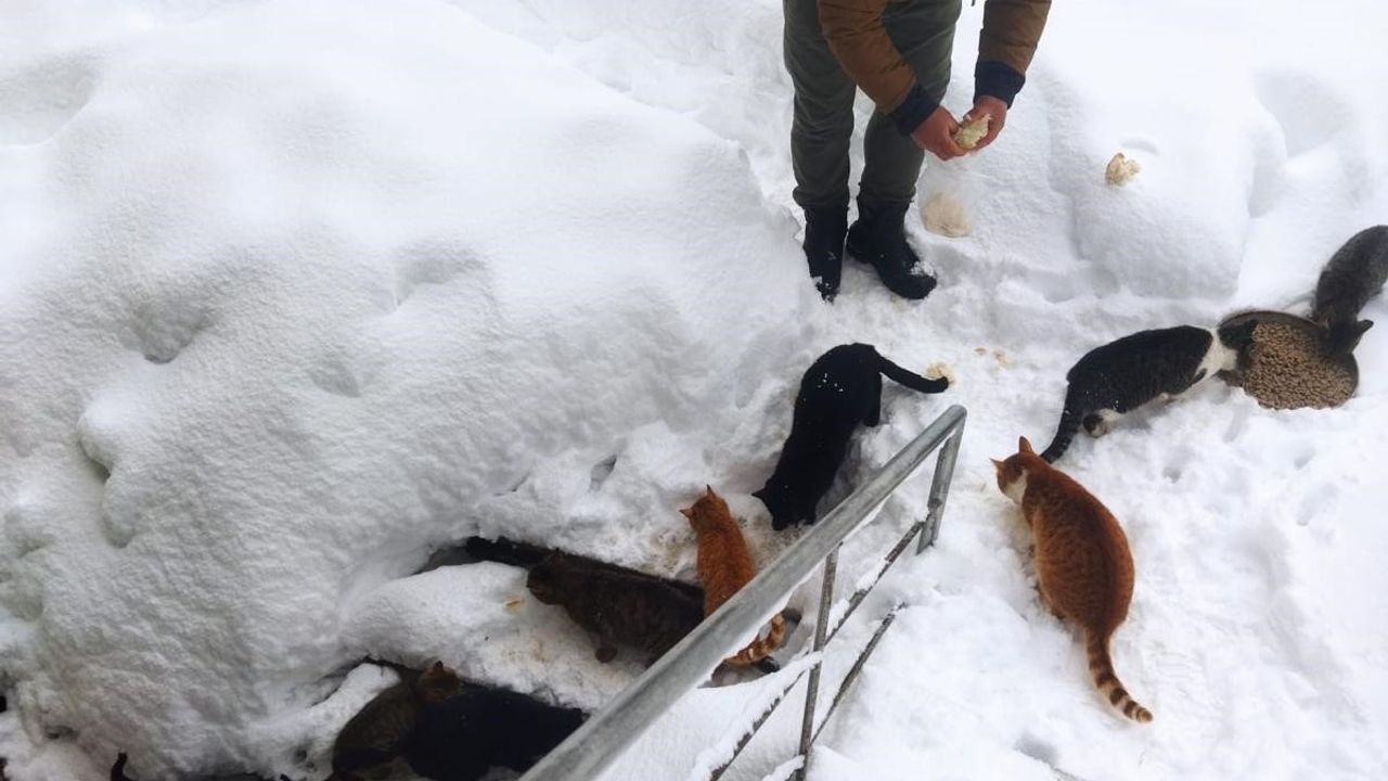 İmamın sesini duyan kediler, boylarını aşan karın içinde zorlanmalarına rağmen, yanına ulaşabilmek için sıralı şekilde yürümeye çalıştı. Kedilerin karda açılan izleri takip ederek ilerlemesi, ortaya renkli ve samimi görüntüler çıkardı.