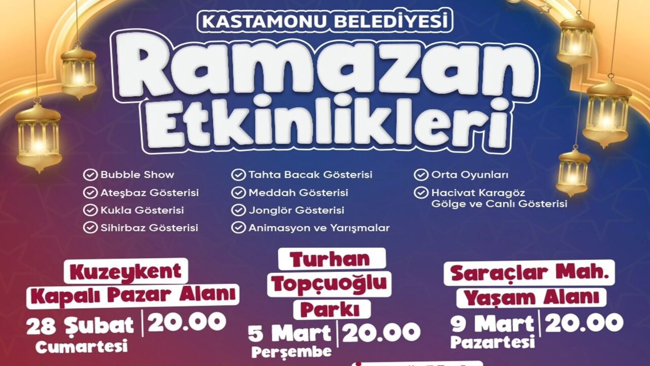 Kastamonu Belediyesi tarafından planlanan Ramazan etkinlikleri; Kuzeykent, Topçuoğlu, Saraçlar, Mehmet Akif ve İnönü mahallelerinde oluşturulacak özel alanlarda gerçekleştirilecek. Her akşam düzenlenecek programlarla mahalle sakinleri hem eğlenceli hem de kültürel içeriklerle buluşacak.