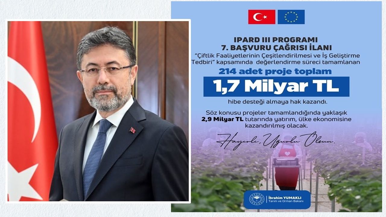 “IPARD III Programı 7’nci Başvuru Çağrı Dönemi kapsamında yapılan değerlendirmeler tamamlandı. Çiftlik Faaliyetlerinin Çeşitlendirilmesi ve İş Geliştirme Tedbiri’ne başvuran 214 proje, toplam 1,7 milyar lira hibe desteği almaya hak kazandı. Projeler tamamlandığında yaklaşık 2,9 milyar liralık yatırım ülke ekonomisine kazandırılmış olacak. Üretimi, istihdamı ve kırsal kalkınmayı destekleyen yatırımlarla kırsalda bereketi büyütmeye devam ediyoruz.”