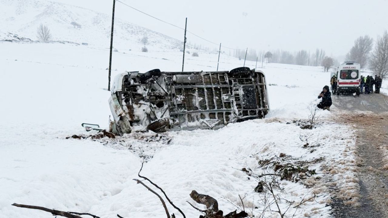 Yoğun kar yağışı ve yolda oluşan buzlanma nedeniyle sürücünün direksiyon hâkimiyetini kaybettiği öğrenildi. Kontrolden çıkan servis aracı, yol kenarındaki şarampole devrilerek durabildi.