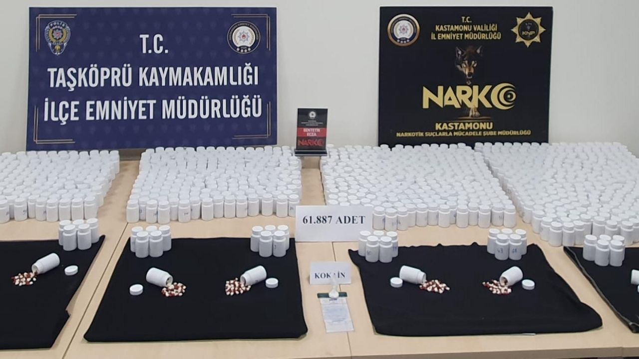 Kastamonu İl Emniyet Müdürlüğü ve Taşköprü İlçe Emniyet Müdürlüğü ekiplerinin ortak yürüttüğü operasyonda, ilçeye bağlı Çiftlik yolu üzerinde şüpheli görülen iki araç durduruldu. Yapılan aramalarda 3 gram kokain ve 61.877 adet sentetik hap bulundu. Olayla bağlantılı olarak 3 kişi hakkında TCK 188 Uyuşturucu ve Uyarıcı Madde İmal ve Ticareti suçundan adli işlem başlatıldı.